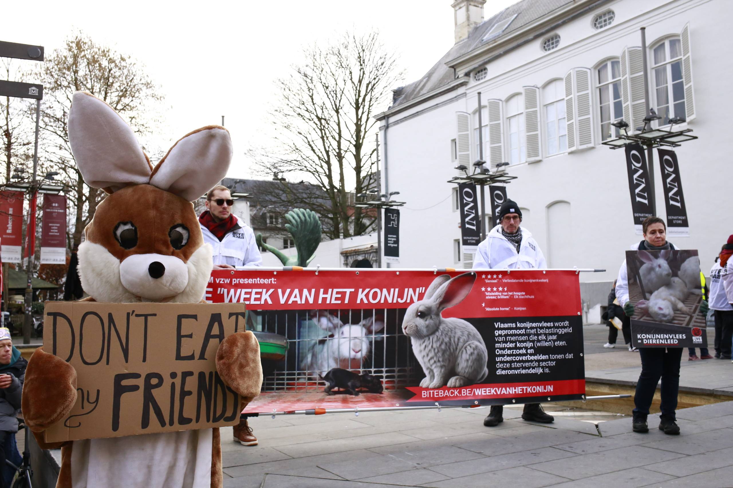 - Slogans als ‘Gesubsidieerd geweld, niet met mijn belastinggeld’ maakten duidelijk dat iedereen meebetaalt aan de promotie van konijnenvlees