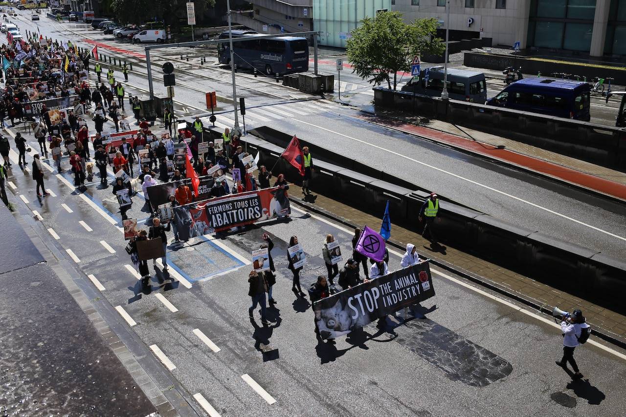 BRUSSEL – Op zondag 16 juni kleurden de straten van Brussel rood en zwart voor de dieren uit de industrie. Meer dan 300 activisten kwamen op straat voor de 908.000 dieren die dagelijks verdwijnen in Belgische slachthuizen, nadat ze een kort en pijnlijk leven leidden.