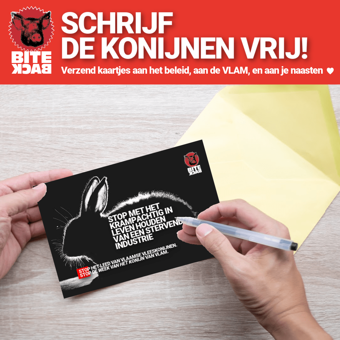 Bezorg onderstaande tekst aan parlementariërs, ministers en CEO’s, maar evengoed aan je familie, vrienden, kennissen. Kopiëer de tekst hieronder, of koop de Schrijf-de-konijnen-Vrij-kaartjes op onze webshop. (Of krijg de kaartjes gratis bij elke andere aankoop op de webshop!)